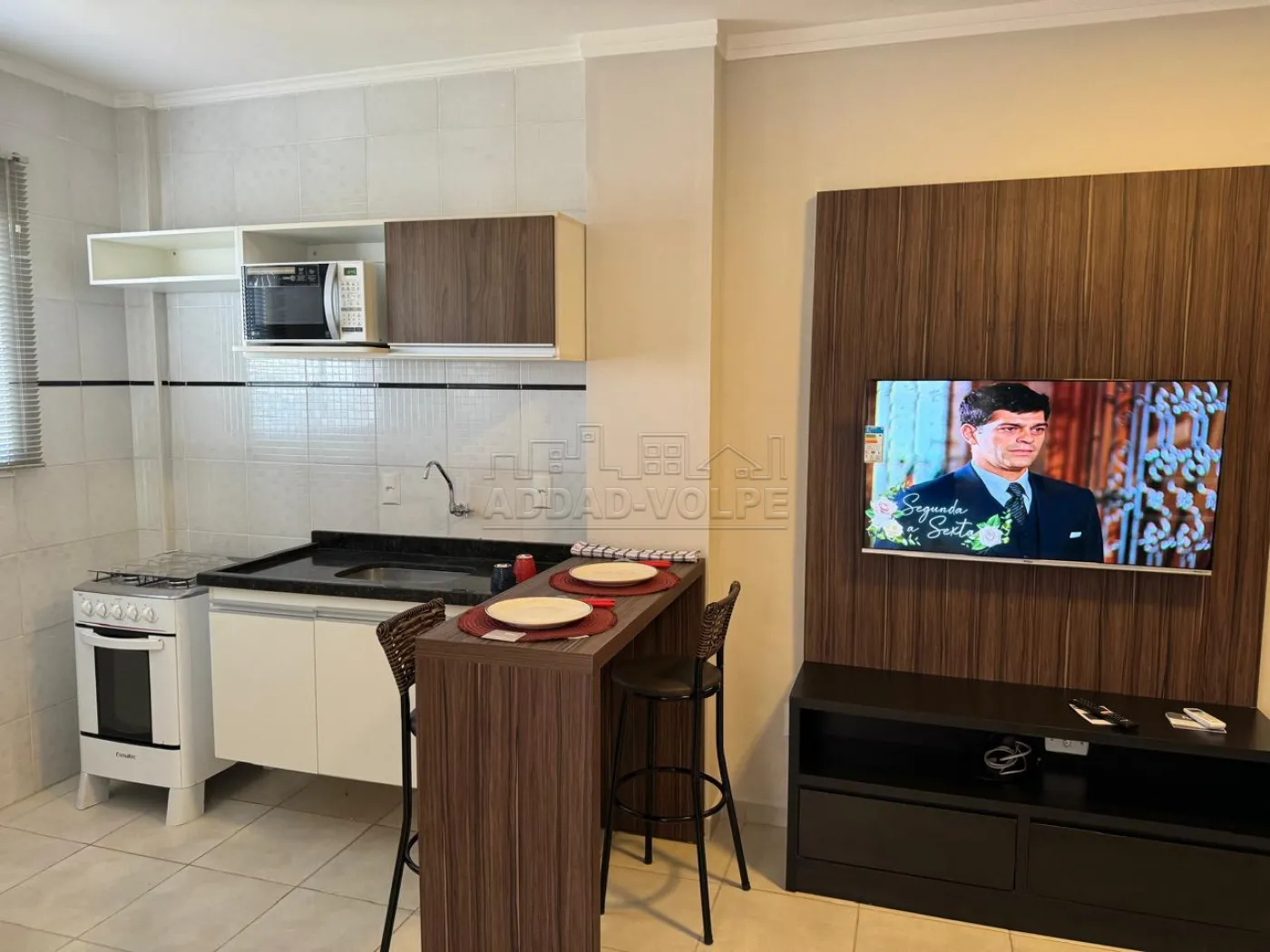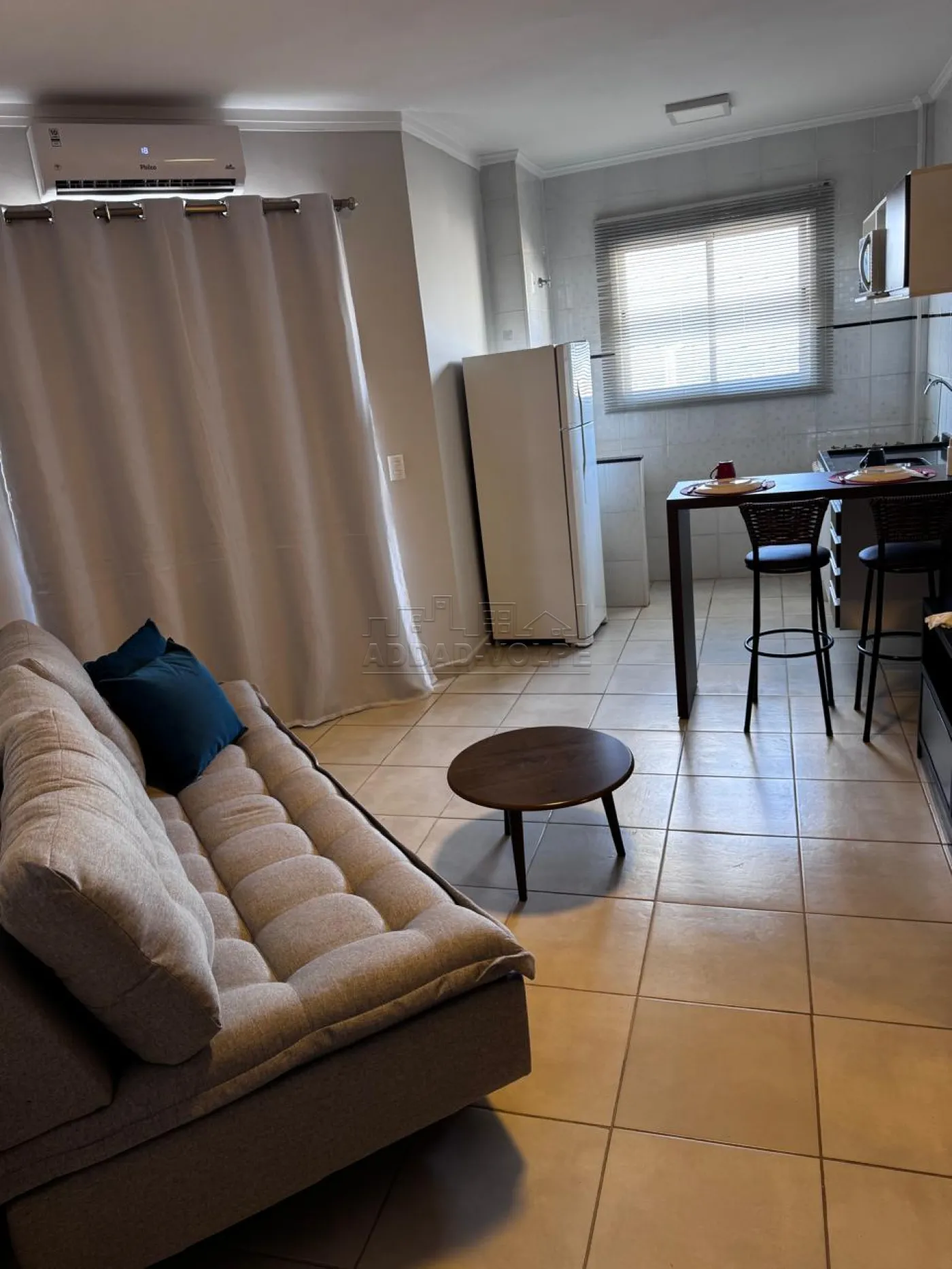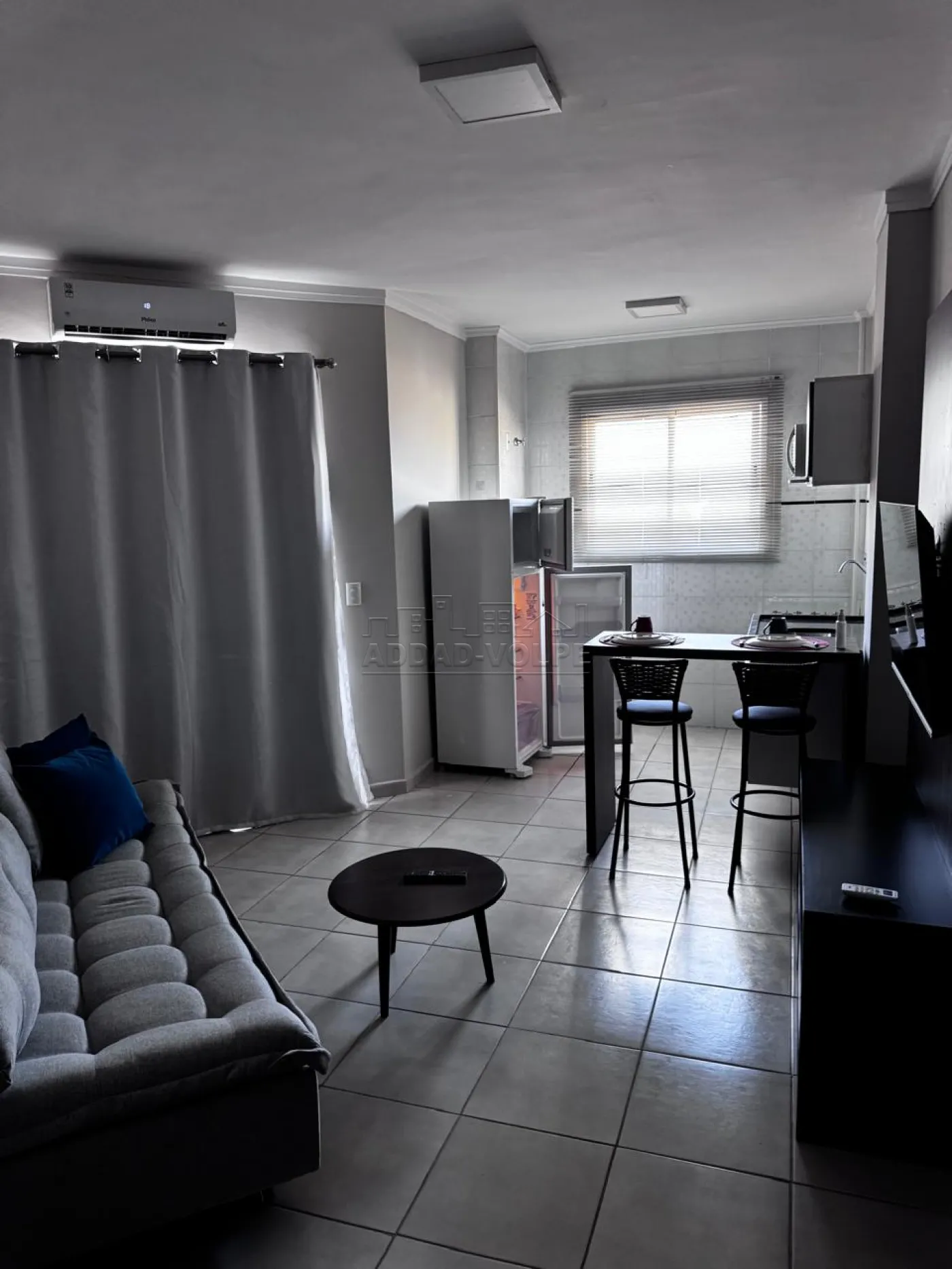 1 dormitório, sala de estar, cozinha, área de serviço, ar-condicionado.