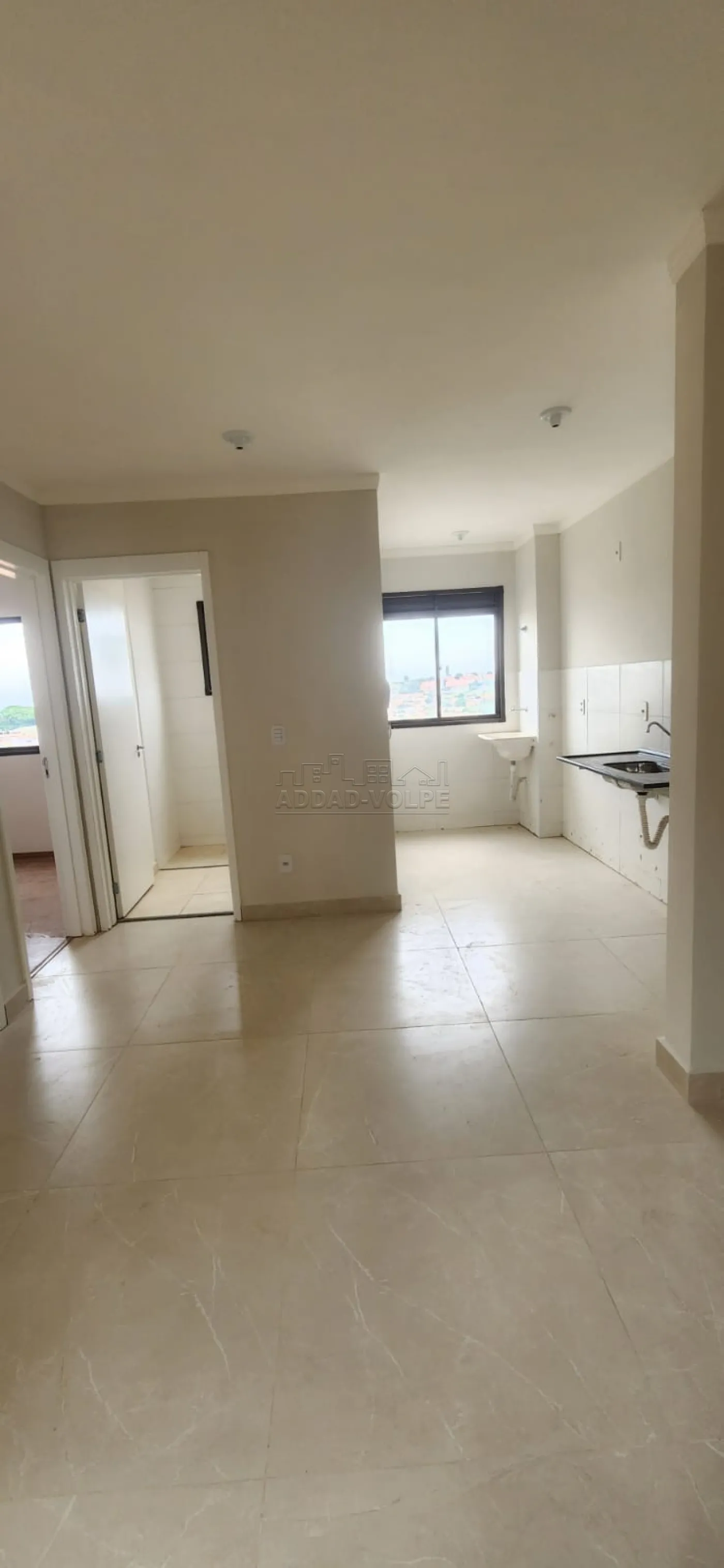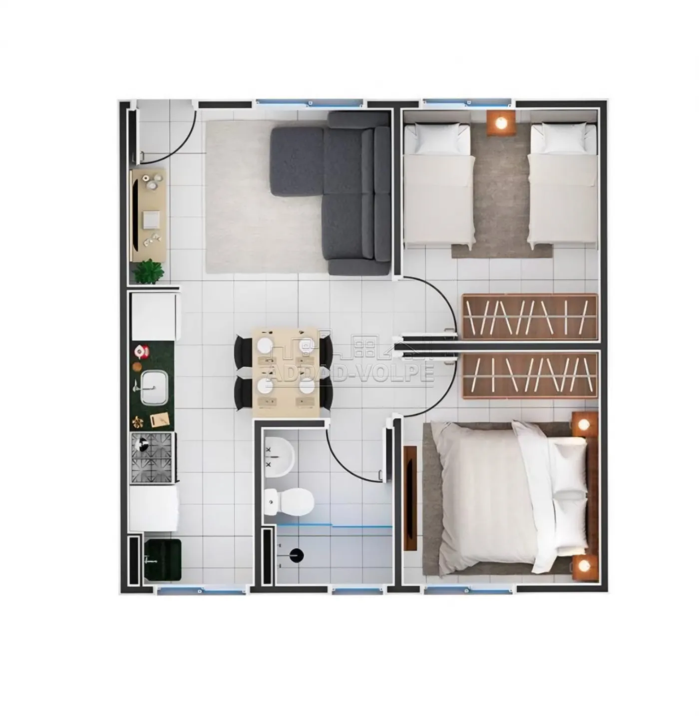 2 dormitórios, sala integrada na cozinha, banheiro social amplo;
