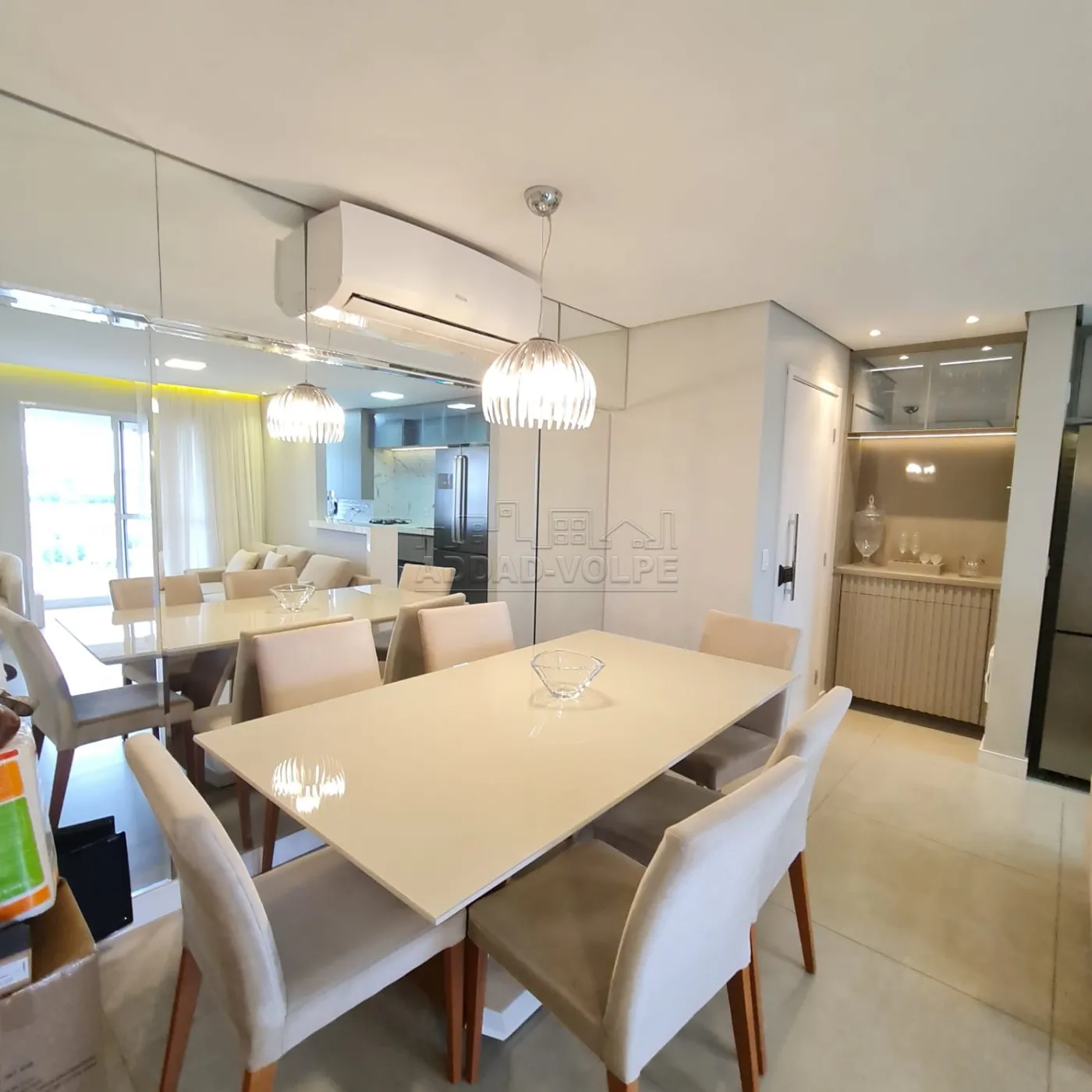 Sala de jantar com parede espelhada e cristaleira.