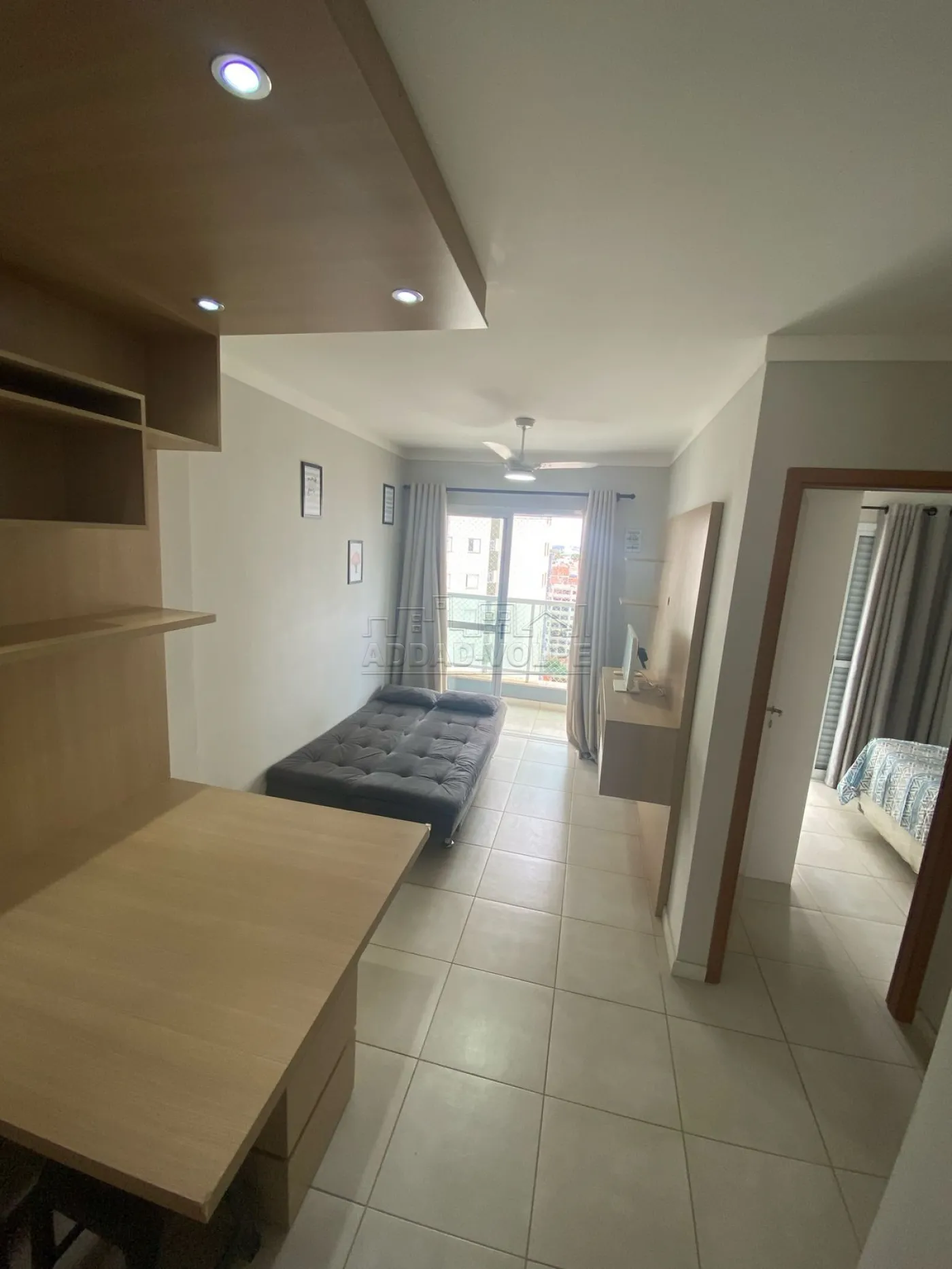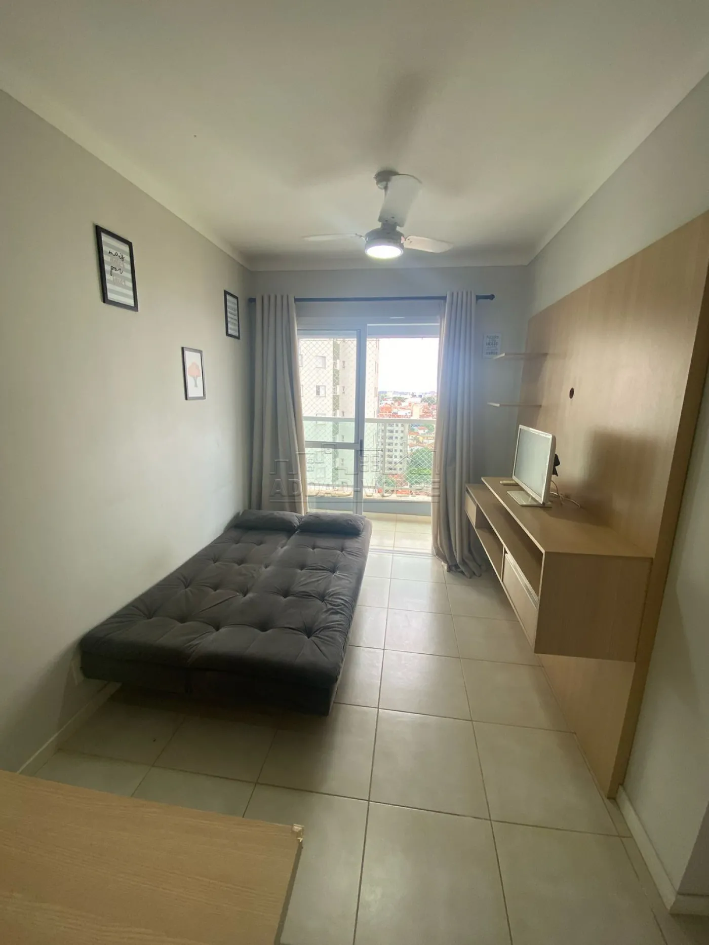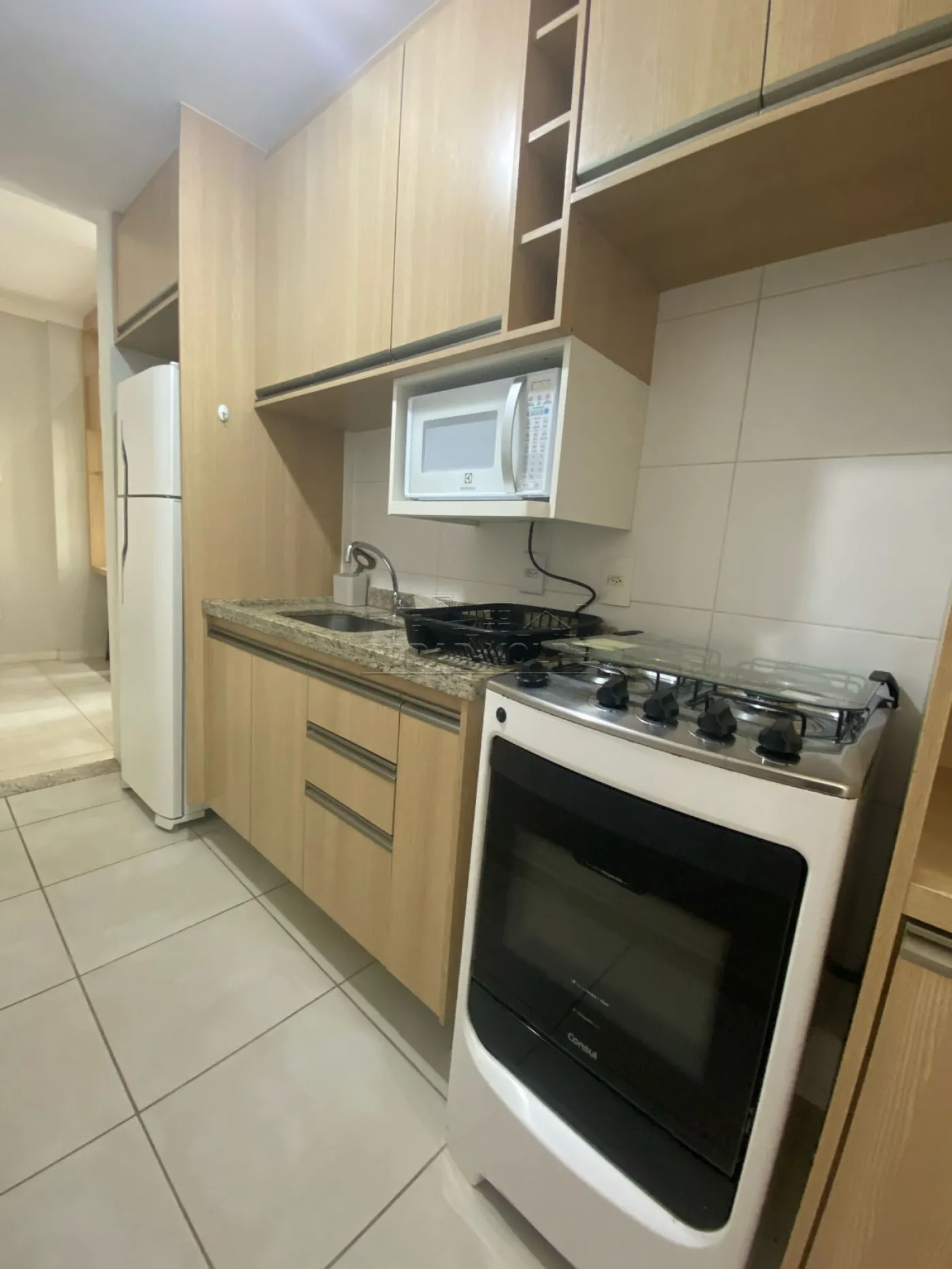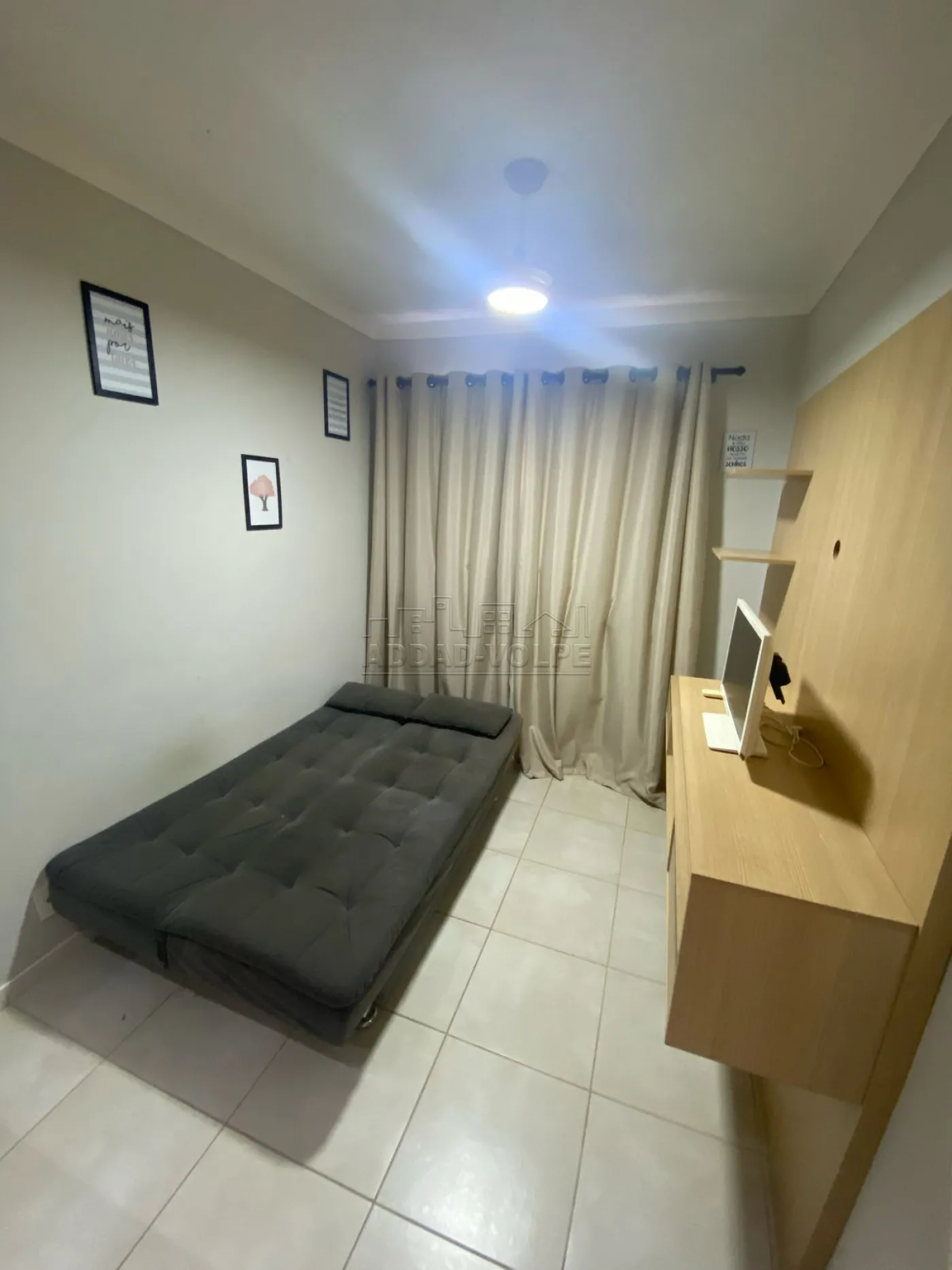 1 dormitório com mobilia, sofá, painel de TV, geladeira, micro-ondas, fogão, cama.