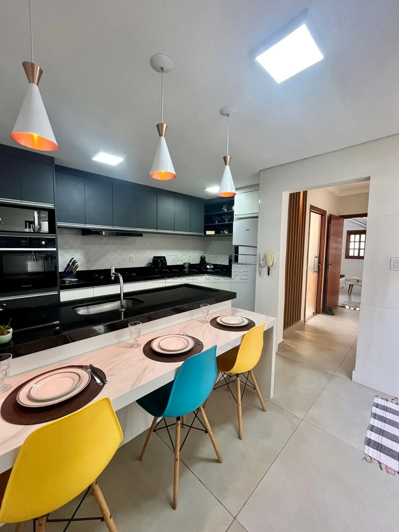 - Cozinha planejada, ampla com bancada, forno a gás embutido, cooktop, coifa;