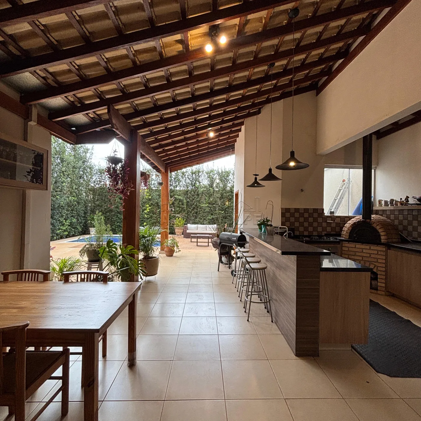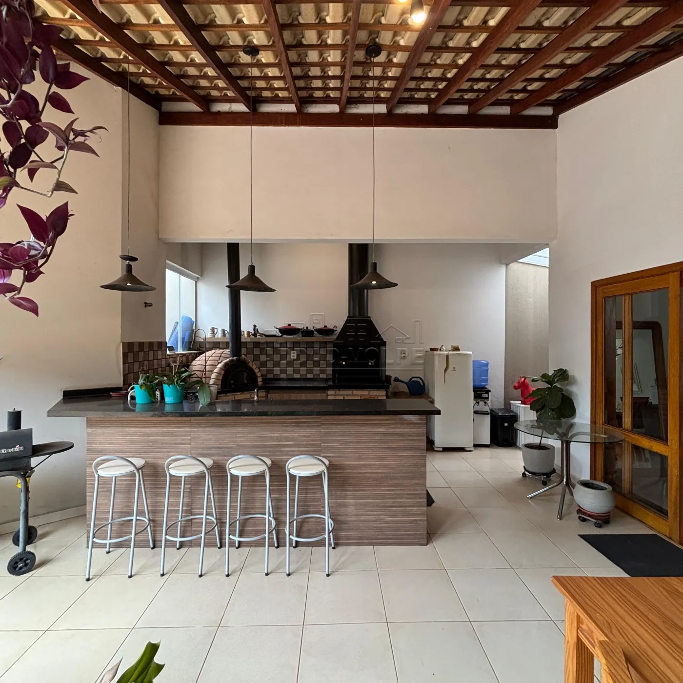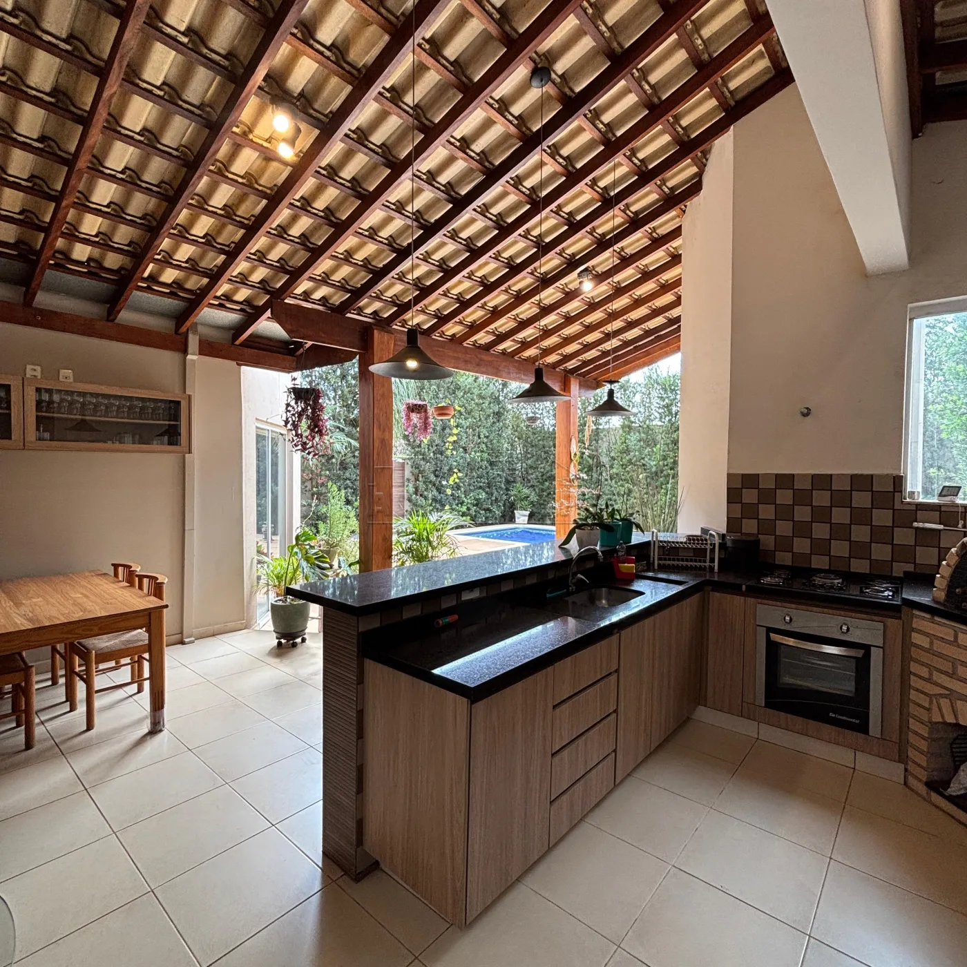 Área de lazer com churrasqueira, forno a lenha, fogão a gás, completa em armários.
