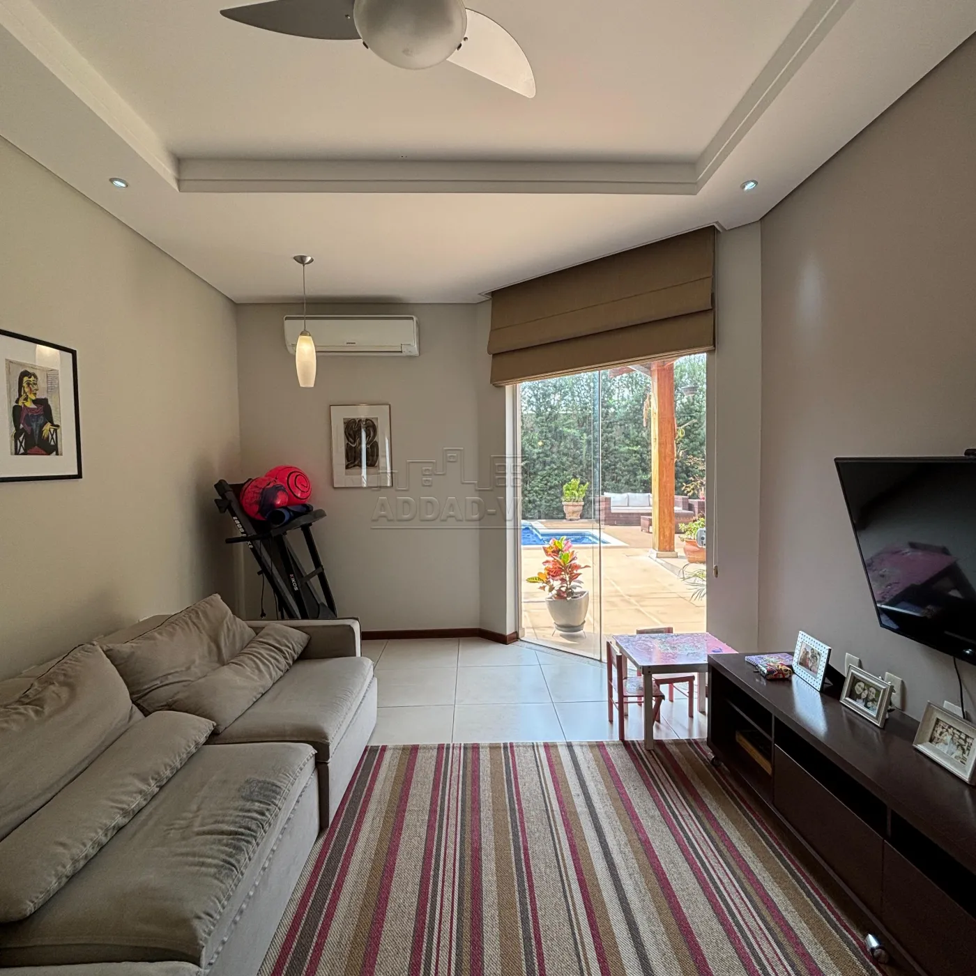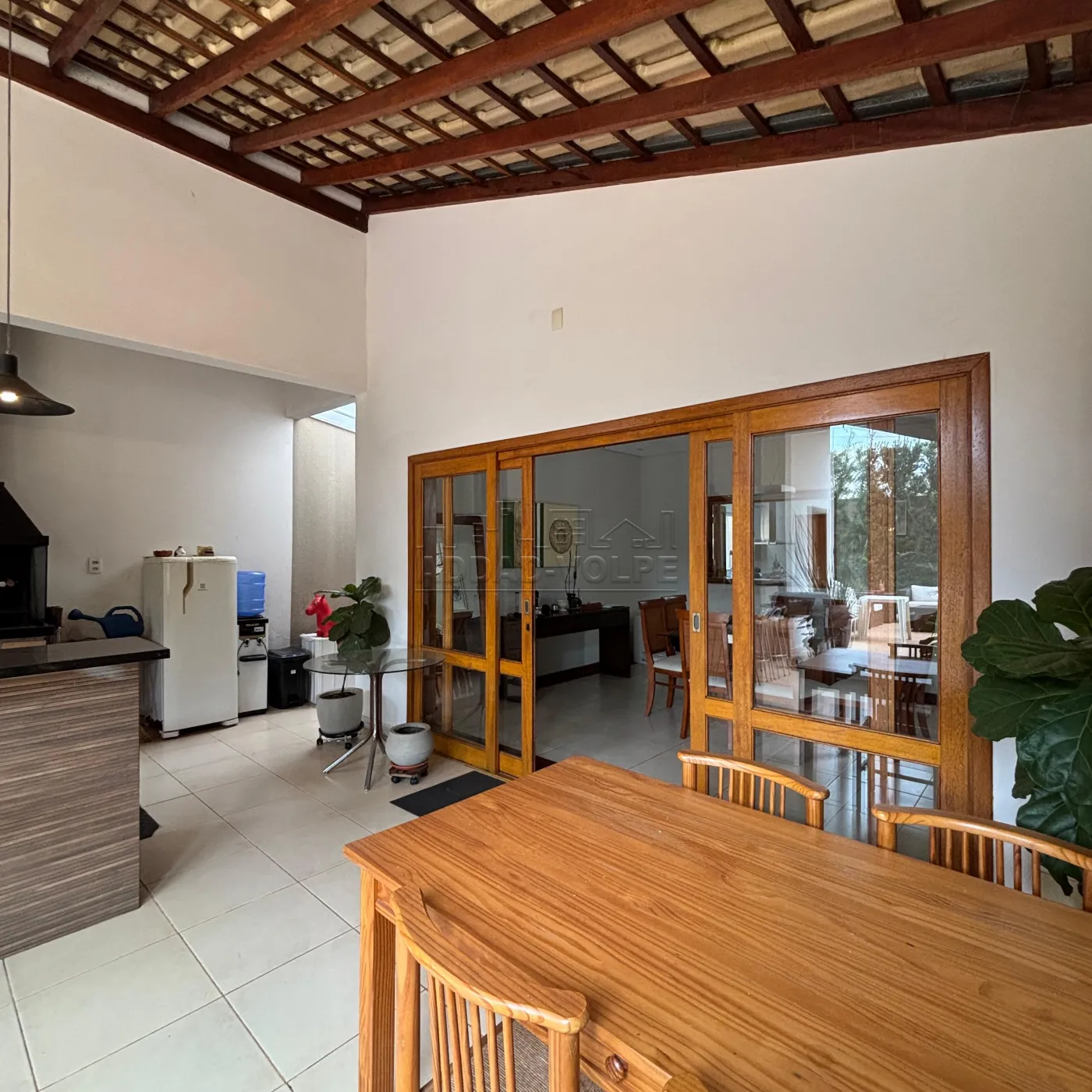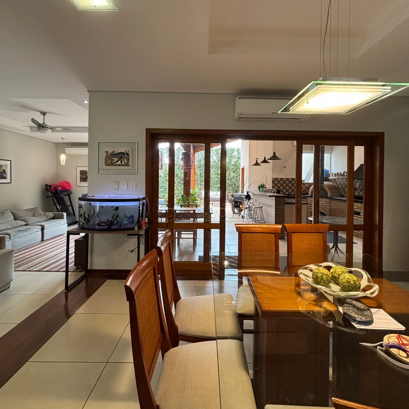 Sala de TV, visita e jantar em `L` integrada com jardim de inverno e lavabo.