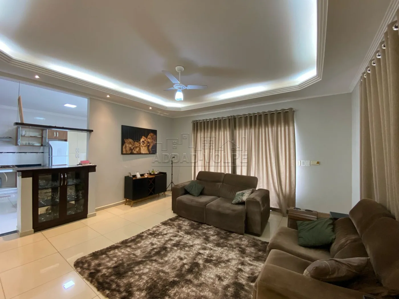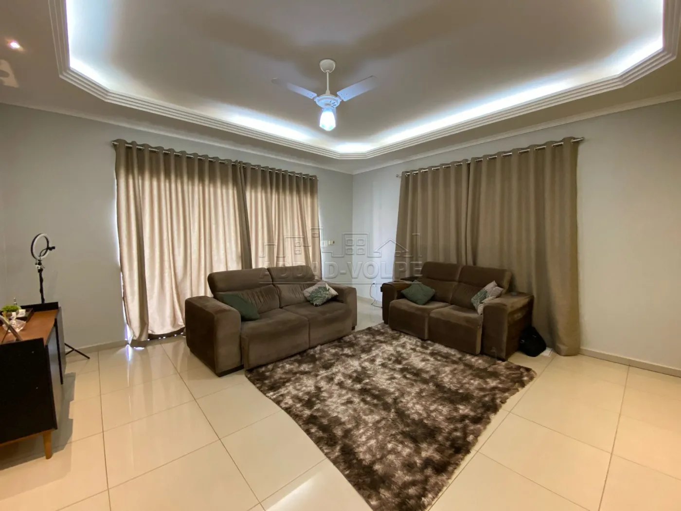 Decorada com estante de gesso, sanca iluminada e piso em porcelanato.
