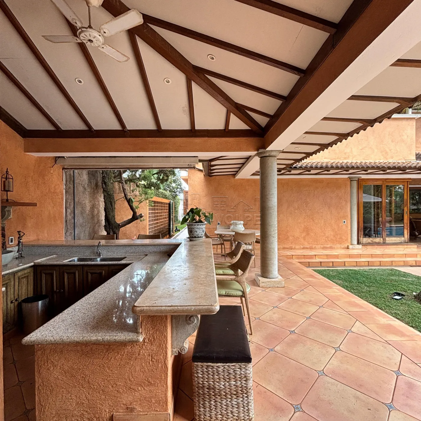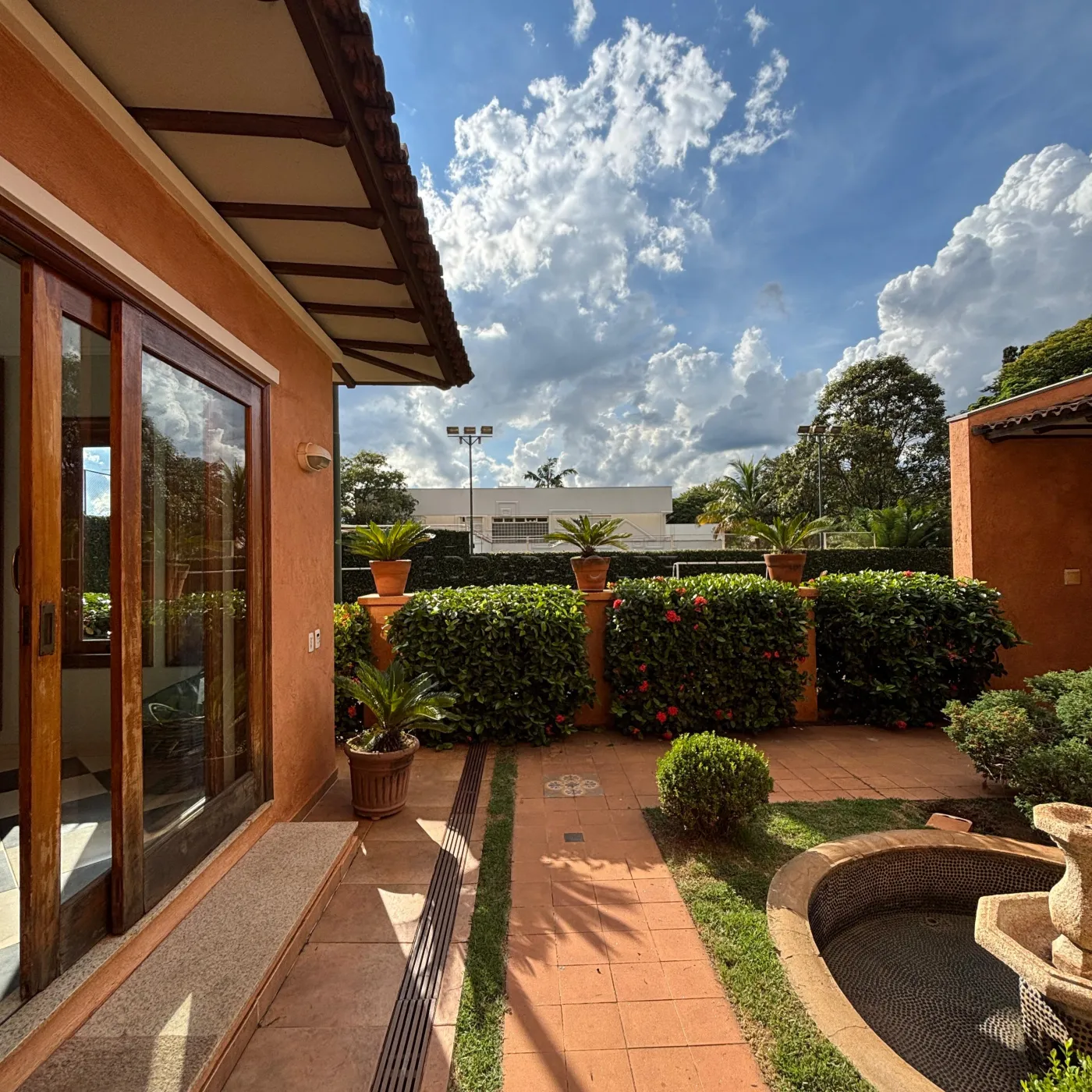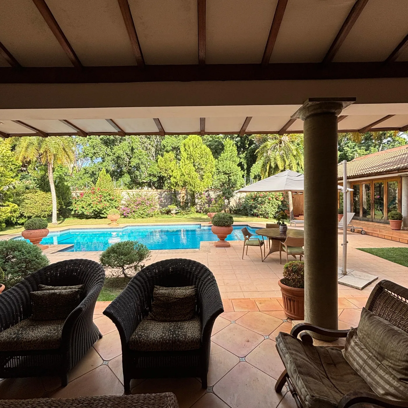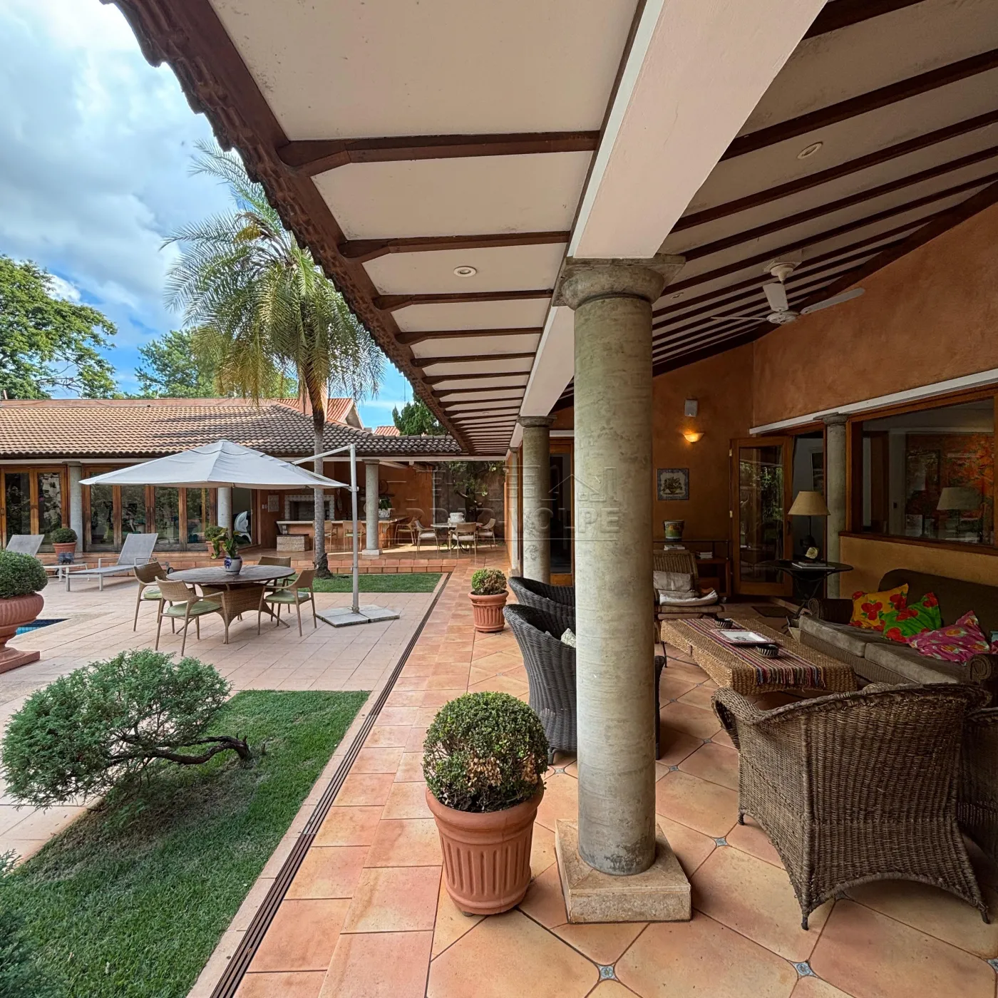Logo na chegada, você se sente transportado para o sul da Europa. A fachada em tom ocre, as colunas imponentes, e o jardim exuberante criam uma atmosfera digna das casas da Provence ou da Toscana.